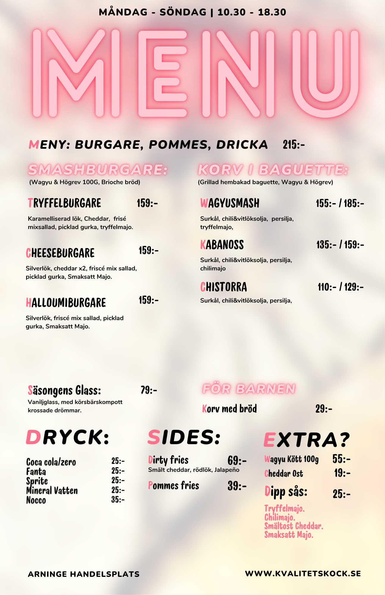 Vi arbetar med noggrant utvalda råvaror där wagyu och högrev möts i perfekt balans för att skapa en saftig, smörig och intensiv smakprofil. Varje burgare tillagas med precision, från den karamelliserade ytan till de noggrant utvalda tillbehören.
